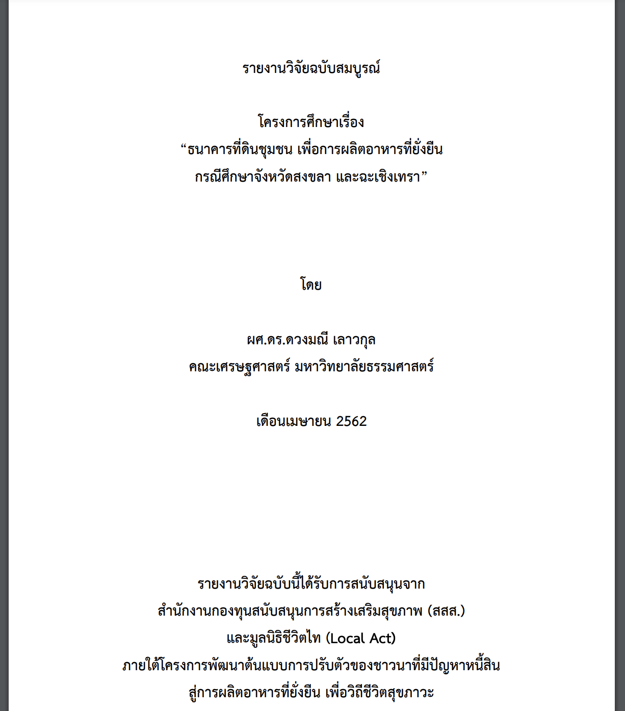 LocalAct_รายงานวิจัยธนาคารที่ดินชุมชนเพื่อการผลิตอาหารที่ยั่งยืน กรณีศึกษาจังหวัดสงขลา ฉะเชิงเทรา