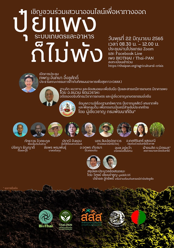 <!DOCTYPE html><br /> <html><br /> <head><br /> </head><br /> <body><br /> <p style="text-align: center;"><strong><span style="font-size: 18pt; font-family: 'arial black', 'avant garde'; color: #583d0c;">ปุ๋ยแพงก็ไม่พัง </span></strong></p><br /> <p style="text-align: center;"><strong><span style="font-size: 18pt; font-family: 'arial black', 'avant garde'; color: #583d0c;">งานประชุมระดมความเห็นเพื่อหาทางออก (focus group) รับมือปุ๋ย-สารเคมีราคาแพง</span></strong></p><br /> <p style="text-align: center;"><span style="color: #2dc26b;"><strong><span style="font-size: 18pt; font-family: 'arial black', 'avant garde';">ในวันที่ 22 มิถุนายน 2565 8.00 - 12.00 น.</span></strong></span></p><br /> <p><span style="color: #e67e23; font-size: 18pt;"><strong>1. หลักการและเหตุผล</strong></span></p><br /> <p><span style="font-size: 14pt;">ราคาปุ๋ยเคมีเพิ่มสูงขึ้นเป็นประวัติการณ์โดยช่วงรอบปีที่ผ่านมาราคาปุ๋ยเคมีเพิ่มสูงขึ้นอย่างก้าวกระโดดทั้งนี้เนื่องจากหลายปัจจัยรวมกันได้แก่ การขึ้นราคาของแก๊สธรรมชาติและน้ำมันเชื้อเพลิงซึ่งเป็นต้นทุนสำคัญของการผลิตปุ๋ยเคมี สงครามในยูเครน และการจำกัดการส่งออกของผู้ผลิตปุ๋ยที่สำคัญ เช่น รัสเซีย และจีน เป็นต้น</span></p><br /> <p><span style="font-size: 14pt;">ราคาปุ๋ยเคมีเริ่มมีราคาสูงขึ้นตั้งแต่เดือนมิถุนายน 2563 และเพิ่มขึ้นต่อเนื่องจนถึงปัจจุบัน เช่น ราคาปุ๋ยยูเรีย (46-0-0) เพิ่มขึ้นจาก 13,400 บาท/ตัน เมื่อเมษายนปี 2564 เป็น 28,000 บาท/ตัน ในช่วงเวลาเดียวกันของปี 2565 และปุ๋ยโพแทสเซียม (0-0-60) เพิ่มขึ้นจาก 12,250 บาท/ตัน เป็น 30,000 บาท/ตัน เป็นต้น (ข้อมูลจากสำนักงานเศรษฐกิจการเกษตร) โดย เมื่อสถิติเมื่อปี 2564 ประเทศไทยนำเข้าปุ๋ยเคมีจากต่างประเทศ คิดเป็นมูลค่ากว่า 70,102.7 ล้านบาท </span></p><br /> <p><span style="font-size: 14pt;">ราคาปุ๋ยเคมีส่งผลกระทบต่อเกษตรกรที่ปลูกพืชและอาจส่งผลกระทบต่อความมั่นคงทางอาหารเนื่องจากการปลูกพืชสำคัญเช่น ข้าว ยางพารา อ้อย ข้าวโพด มันสำปะหลัง ปาล์มน้ำมัน เป็นต้น อาศัยการใช้ปุ๋ยเคมีเป็นแหล่งอาหารสำคัญของพืช และต้นทุนของปุ๋ยเคมีและสารเคมีกำจัดศัตรูพืชคิดเป็น 25-35% ของต้นทุนการปลูกพืชทั้งหมด </span></p><br /> <p><span style="font-size: 14pt;">วิกฤตอาหารในระดับโลกที่ทำให้ผลผลิตทางการเกษตรส่วนใหญ่มีราคาสูงขึ้น เช่น ข้าวสาลี ข้าวโพด อ้อย และปาล์มน้ำมัน เป็นต้น อาจเป็นโอกาสของเกษตรกรที่ปลูกพืชบางกลุ่ม แต่ผลประโยชน์ดังกล่าวอาจถูกลดทอนจากต้นทุนปุ๋ยเคมีและสารเคมีที่เพิ่มขึ้น ในขณะที่เกษตรกรส่วนใหญ่ของประเทศ ซึ่งคิดเป็นสัดส่วนถึง 79% ของเกษตรกรทั้งหมด ได้แก่เกษตรกรที่ปลูกข้าว และยางพาราจะได้รับผลกระทบอย่างหนักเนื่องจากต้นทุนสูงขึ้นแต่ราคาในตลาดโลกกลับไม่ได้ปรับขึ้นตามราคาของสินค้าอื่น</span></p><br /> <p><span style="font-size: 14pt;">อย่างไรก็ตาม การวิเคราะห์ของนักวิชาการและผู้เชี่ยวชาญระหว่างประเทศ เช่น Aaron Smith แห่ง University of California เห็นว่าราคาปุ๋ยที่สูงขึ้นจะทำให้การใช้ปุ๋ยต่อพื้นที่ลดลง มีประสิทธิภาพมากขึ้น และเป็นผลดีต่อสิ่งแวดล้อมและระบบนิเว