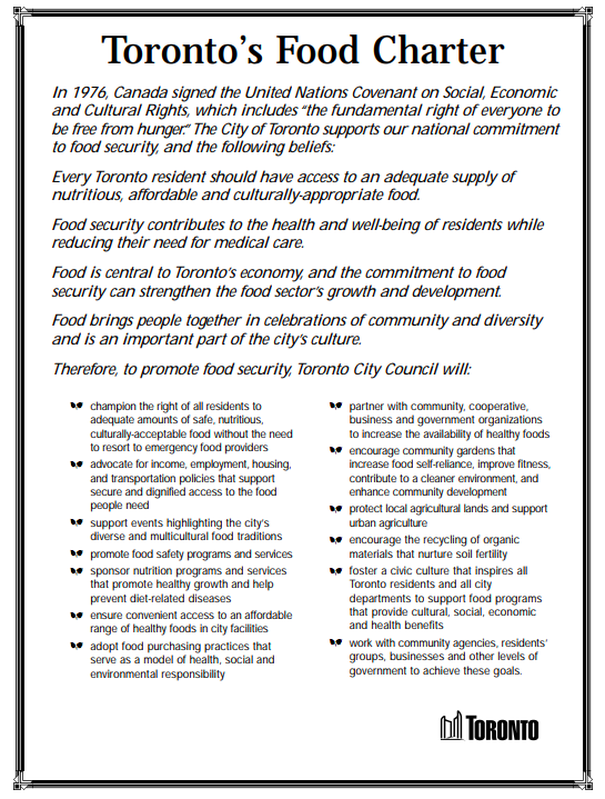 สภาอาหารเมืองโตรอนโตร่วมเป็นส่วนหนึ่งในการออกแบบคำเรียกร้องให้เมืองโตรอนโตตอบรับเป้าหมายในการทำให้เมืองใส่ใจเรื่องอาหารด้วยการเสนอกฏบัตรอาหาร (Food Charter) ให้เทศบาล และในเวลาไม่กี่เดือน ในปี 2001 เทศบาลเมืองโตรอนโตตอบรับกฎบัตรนี้ด้วยคะแนนเป็นเอกฉันท์ ยอมรับสถานะสภาอาหารเมืองโตรอนโตในฐานที่ปรึกษาด้านนโยบายอาหารของเทศบาลภายใต้คณะกรรมการสาธารณสุขของเมือง นอกจากนี้ เมืองโตรอนโตยังร่วมกำหนดเป้าหมายให้เป็น “เมืองที่มีความมั่นคงทางอาหาร” (Food-secure city) ซึ่งประกอบด้วยคำมั่นสัญญาหลัก 4 ข้อได้แก่ ทำให้ประชาชนเข้าถึงอาหารที่มีคุณภาพและคำนึงถึงวัฒนธรรมมากขึ้น กำหนดให้ประชากรมีรายได้ที่เหมาะสมที่สามารถเข้าถึงอาหารได้ ทำให้มีข้อมูลเรื่องอาหารและโภชนาการมากขึ้น และส่งเสริมระบบผลิตอาหารที่ยั่งยืน (กฎบัตรอาหารเมืองโตรอนโต อ้างใน Blay-Palmer, 2009)