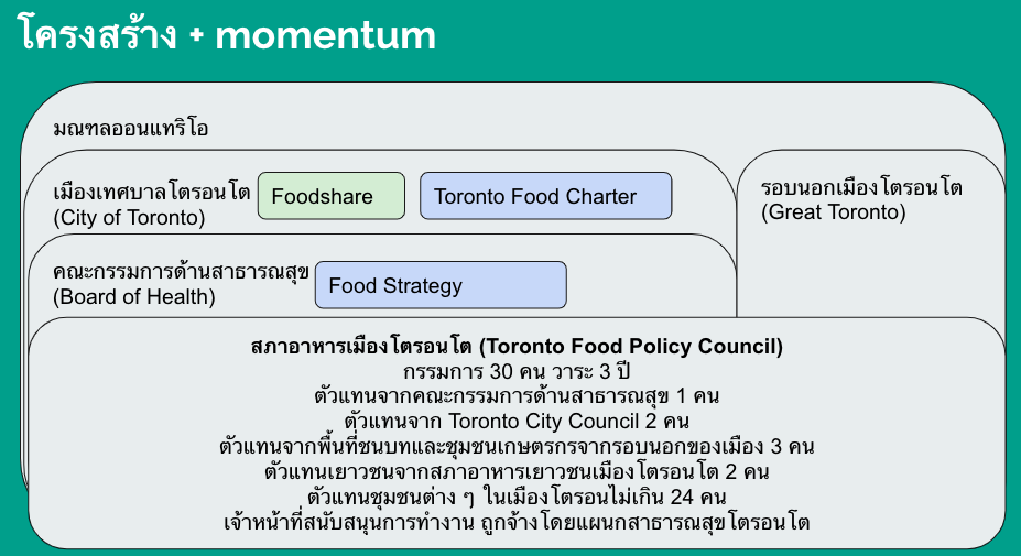 อย่างไรก็ตาม สภาอาหารเมืองโตรอนโตก็ไม่ใช่องค์กรเดียวที่ทำเรื่องอาหาร แต่ยังมีกลุ่มอื่น ๆ ในเมืองที่ร่วมกันสร้างนิเวศในเมืองให้เกิดการตื่นตัวเรื่องอาหาร เช่น Foodshare ที่เป็นเสมือนโครงการปันอาหาร โครงการที่อยู่อาศัย Regent Park และเครือข่ายอธิปไตยอาหารของคนผิวดำ (Black Food Sovereignty) ซึ่งแต่ละโครงการก็มีการทำงานร่วมกันในด้วยตามสถานการณ์และประเด็น จุดเด่นของ สภาอาหารเมืองโตรอนโต คือจะเน้นเรื่องความมั่นคงทางอาหาร ในมิติเรื่องการเข้าถึง ความเพียงพอ ความปลอดภัย โภชนาการ อาหารที่เหมาะสมกับวัฒนธรรมหนึ่ง ๆ วางแผนสอดคล้องกับนโยบายสาธารณสุขขั้นพื้นฐานของรัฐออนตาริโอเพื่อลดความเหลื่อมล้ำทางด้านสุขภาพ ด้วยการมองอาหารแบบ multifunctional ที่เชื่อมตัดกับนโยบายอื่น ๆ โดยเริ่มจากการสร้างพื้นที่ให้สภาอาหารเมืองโตรอนโต เป็นส่วนหนึ่งของชุมชนเมืองโตรอนโตในการรับที่จะเป็นกระบอกเสียงให้ประชาชนและเสริมศักยภาพในการแสดงความคิดเห็นต่อการพัฒนาเมืองและนโยบายที่เกี่ยวข้อง โดยเฉพาะกลุ่มเปราะบาง ในรูปแบบการทำงานนั้น สภาอาหารทำงานแบบอิสระและไม่ได้ขึ้นอยู่หน่วยงานภาครัฐใดจึงมีความยืดหยุ่นกว่า แม้ว่าจะอยู่ในระบบกลไกการกำกับดูแลของรัฐในบริบทเมือง นอกจากนี้ยังมีผู้ประสานงานที่ทำงานในระยะยาวและกรรมการที่กระตือรือร้นและทำงานต่อรองในระบบเป็น เช่น Jennifer Welsh, Rod MacRae และ Wayne Roberts รวมทั้งกำลังของอาสาสมัครที่เข้ามาเป็นกรรมการและให้ความคิดเห็นจากประสบการณ์และความเชี่ยวชาญที่หลากหลาย ทำให้คณะกรรมการของสภาอาหารเมืองโตรอนโตมีศักยภาพในการมองปัญหาที่ซับซ้อน และสามารถนำเสนอแนวทางในการแก้ไขปัญหาเชิงนโยบายได้อย่างเป็นรูปธรรม รวมทั้งปรับตัวให้เข้ากับสถานการณ์ที่เปลี่ยนไปอย่างรวดเร็วตามเงื่อนไขของเมือง
